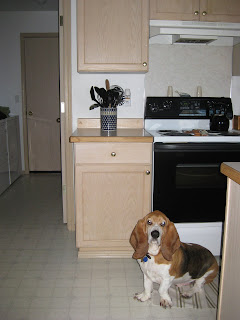 An extra bonus that comes with already completing a week of the deployment...Obadiah has overcome his slump of depression. He has been laying at the top of the stairs, letting out a deep sigh with each exhale as he looks on for James. (See picture above) However, I think he's finally over that stage. Now, he just goes to the kitchen demanding dental chews 20 times a day. The rule is one a day, no more, but he seems to think that this adjustment should allow for more. Below is pretty much how I find him every hour...sitting there like an angel hoping and waiting for a dental chew (They are stored in the cabinet above, and he, of course, knows that well). Even though he is determined and stubborn, he has yet to win the battle. I doubt he's going to give up anytime soon.