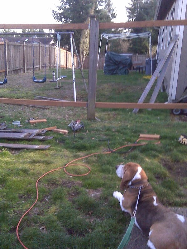 So, that was an exciting moment to our day. Once they got most of the slats back up, I let Oba off the leash to run and boy did he ever! He sprinted around the yard like a madman while barking his head off. I guess he had to let everyone know who's boss around here. I'm just glad it got that crazy energy out of him, resulting in a date with his pillow for the rest of the evening. What a life!