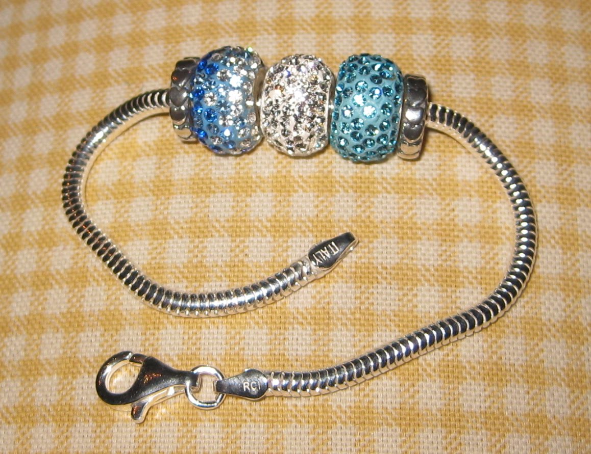 The only good that came of this hallmark holiday was the fact that I now have a bracelet to signify our three babies. I had been thinking about getting something for quite some time, but never completely decided on what that might be. About a week ago, I finally gave in and got this particular bracelet while at Helzberg. They were having a special for Mother's Day (of course!) where you got the bracelet free when you purchase 5 charms from the Expressions collection. That was perfect, since I would be buying 5 anyways -- 1 for each kid and 2 stoppers. They didn't have Jake's birthstone in the crystal design that I chose, so I got what resembled the closest thing to Sapphire...