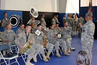As usual, they had the Army band playing while we waited. They then had some local talent play some song about freedom -- you know, trying to build up that sense of pride right before the guys walk in. By the time that was over, we knew it was time. On the other side of the gym, behind the curtain, were our soldiers in formation waiting. As they lifted the curtain, the screams and cheers were let out and the ceremony began. Thankfully, the Col. chose to make a super quick speech -- as opposed to those where they like to hear themselves speak -- before releasing our guys. At that time, it was done and OVER. When they got the final word, the families ran ahead trying to find their guys in the mess of camouflage.