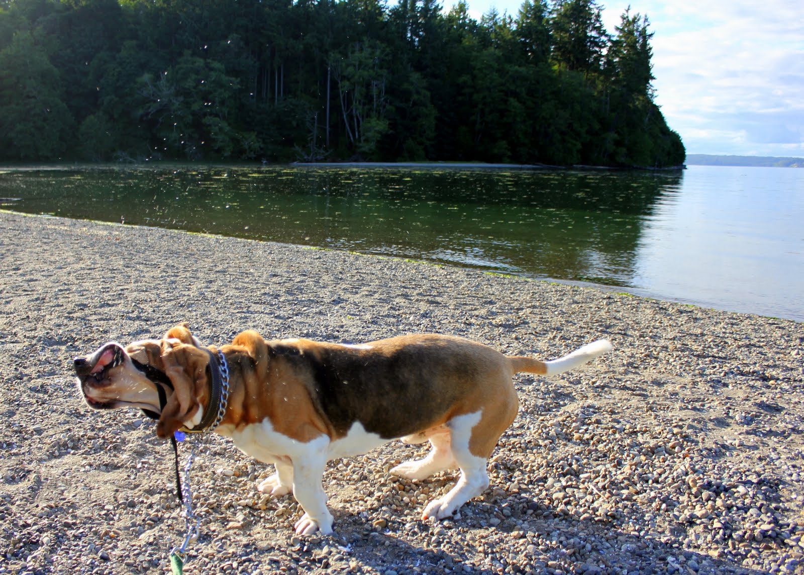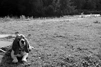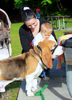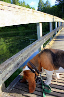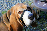 With knowing I was going to take the camera with me, I had to figure out a way to keep Oba under control. That crazy basset doesn't do too well with the leash -- at least not with me! You'd think he had no manners at all when we go on walks. With all the pulling, choking, stopping in his tracks to sniff, etc., taking Obadiah out can be quite an adventure. Knowing that in advance, I searched through his rubbermaids (yes, he has that much junk to his name) for his old prong collar or something else that would keep him in line. Unfortunately, I couldn't find his prong collar, but I found one of those gentle leaders instead. It's one of those attachments that goes over his muzzle and helps control him a little better. I've only used it once before (several years ago), and got a complaint from a jogger claiming that I was abusing Obadiah -- he has a way of making himself look like the victim, doesn't he? Even though I had it on him correctly, the comment was enough to make me never use it again...until today. Wow...what a difference that thing makes! Oba didn't pull me once during the entire trip! Unfortunately for that poor pup, it will now become a staple when taking him out.