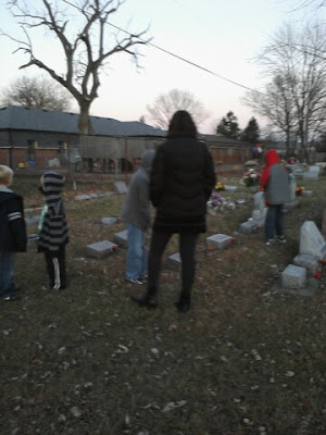Judah and Josh (the shorty behind Judah) looking at Liv's grave while Ben read the headstone of a baby behind Livy...